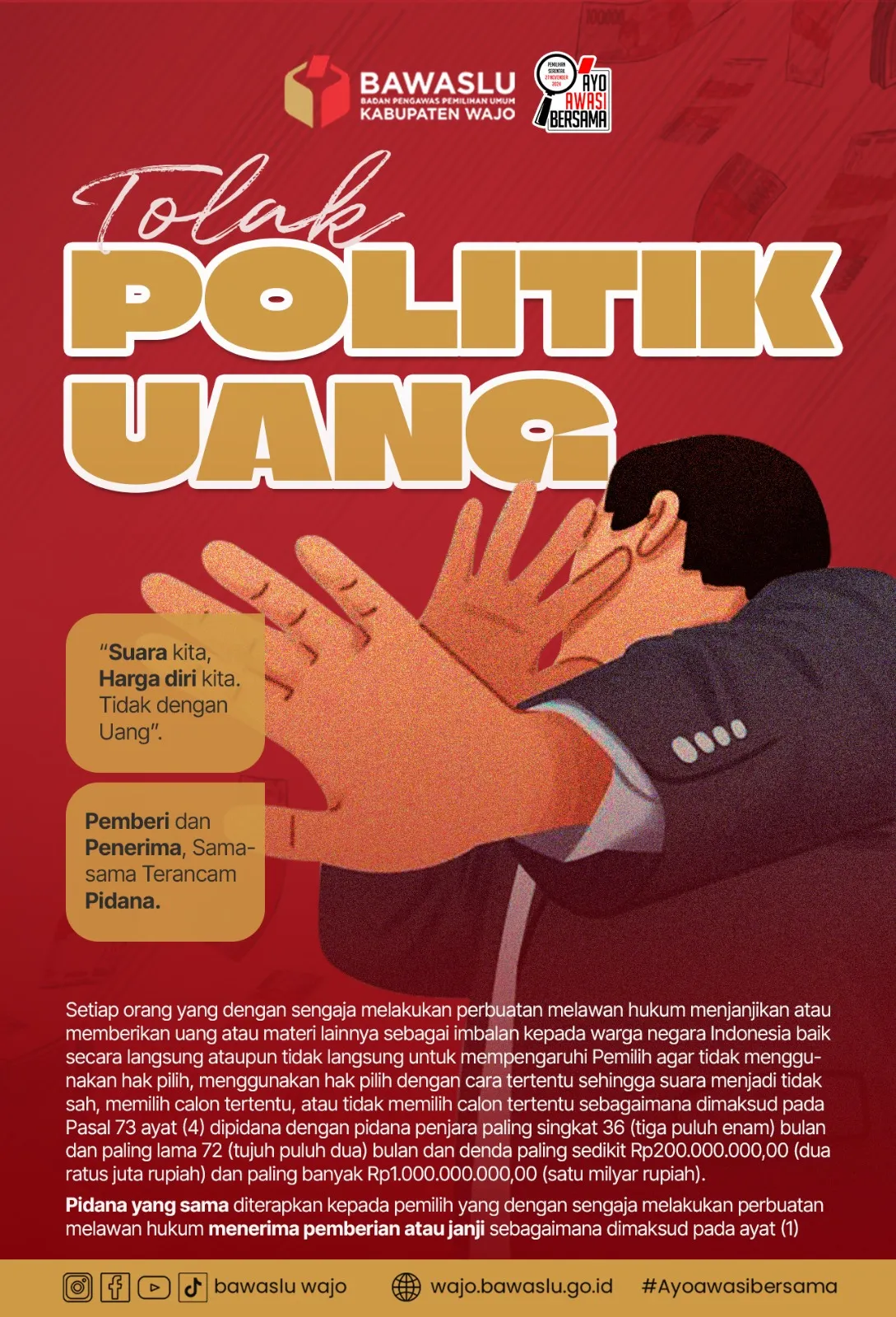 Pengumuman Contoh Pengumuman Lihat Selengkapnya Lapor Pelanggaran Pemilu Hasil Pengawasan Tahapan Pemilu 2024 Ajukan Permohonan Sengketa Proses Pemilu Bagaimana Cara Ikut Awasi Pemilu Lapor Hoaks Pemilu Apa Saja Yang Diawasi Pada Tahapan Pemilu Berita Bawaslu Wajo Hadirkan KADERA: Media Cepat Bawa Informasi Pengawasan Langsung ke Telinga Publik humas Selasa, November 4, 2025 - 22:16 Bawaslu Wajo Siapkan Podcast “KADERA” untuk Dekatkan Demokrasi ke Publik humas Senin, November 3, 2025 - 22:08 Mardiana Rusli: Kritik dan autokritik adalah menjadi catatan penting dalam memperbaiki tata kelola kelembagaan Bawaslu dalam mewujudkan pemilu berintegritas humas Kamis, Oktober 30, 2025 - 13:13 Bagja : Penyusunan Aturan Teknis Pemilu Harus Transparan humas Sabtu, Oktober 4, 2025 - 14:00 Abdul Malik : Setiap laporan masyarakat harus ditindaklanjuti sesuai aturan hukum dan perundang-undangan pemilu humas Jumat, Oktober 3, 2025 - 16:26 https://sigaplapor.bawaslu.go.id/ https://ppid-wajo.bawaslu.go.id https://sips.bawaslu.go.id/ https://google.com https://jdih.bawaslu.go.id/ Galeri TOLAK POLITIK UANG! Rapat Koordinasi Sentra Gakkumdu Kabupaten Wajo Pencarian Saran dan Pengaduan Saran dan pengaduan dengan untuk kemajuan Bawaslu Ajukan