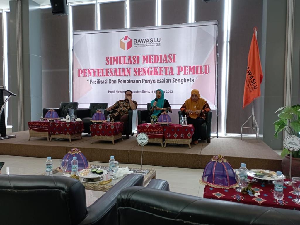 Sambutan Ketua Bawaslu Provinsi Sulawesi Selatan\n\n\n\nHadir dalam kegiatan Simulasi Mediasi Penyelesaian Sengketa Pemilu ini yakni Wakil Bupati Bone H Ambo Dalle, perwakilan Pengadilan Negeri Kabupaten Bone dan Perwakilan Kesbangpol, Anggota KPU Sulsel Dr.Upi Hastati,M.H, Anggota Bawaslu Sulsel Kordiv Penyelesaian Sengketa Asradi, Kordiv Pengawasan Amrayadi, Kordiv Hukum dan Datin Adnan Jamal, serta Kordiv Humas Saiful Jihad serta seluruh jajaran Anggota Bawaslu dan Kepala/Koordinator Bawaslu se-Sulsel