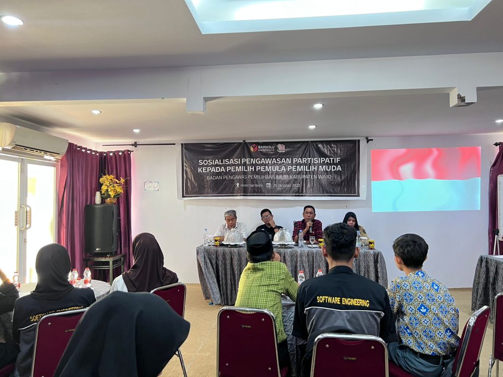 Wajo, Bawaslu Wajo - Bawaslu Wajo memberikan edukasi pemilu kepada pemilih pemula pada kegiatan sosialisasi pengawasan partisipatif kepada pemilih pemula pemilih muda di Hotel Sermani, Kamis (26/10/2023)